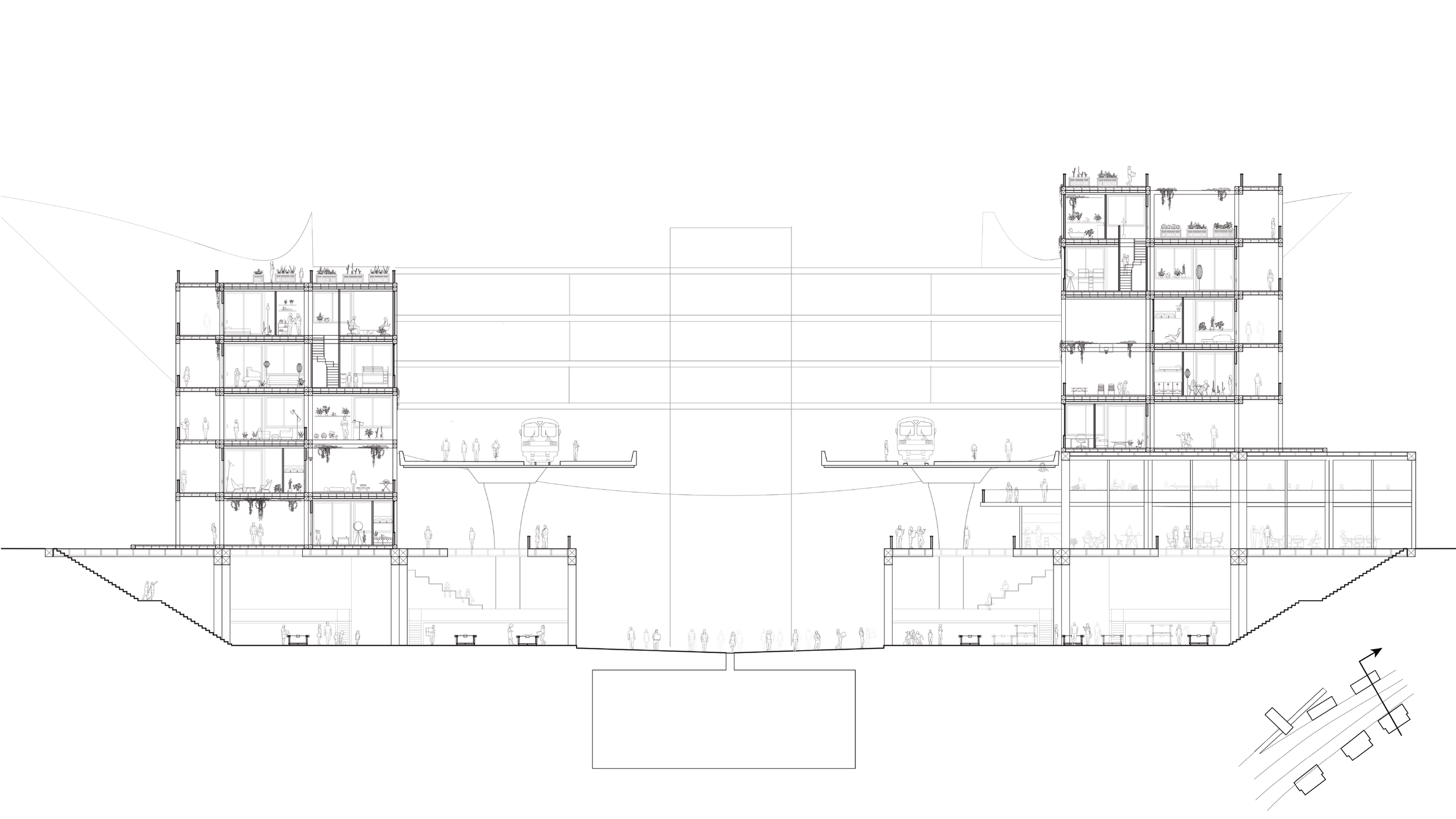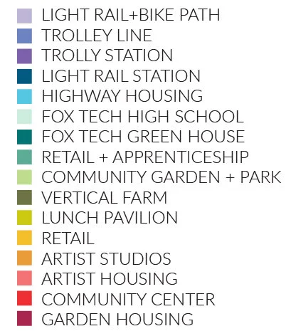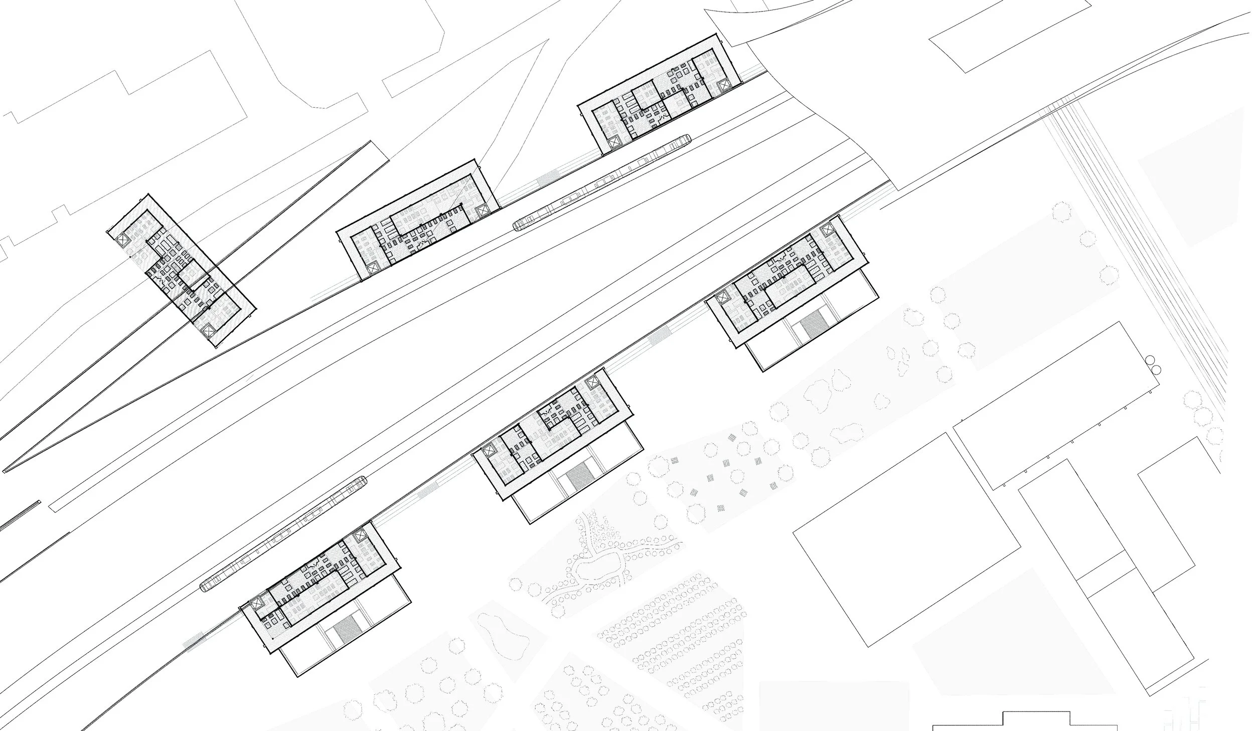 Highway Housing is part of a larger urban plan to revive an area near downtown San Antonio covered in parking garages. This dead zone is adjacent to I-35 which divides a residential community from the amenities downtown offers. The urban plan focuses on public transit, completely eliminating cars from about 30 city blocks. It reclaims the highway as tracks fire high-speed rail and proposes trolley lines running through the community to connect it to jet points in San Antonio at a more local scale. Highway HOuses is a housing community that straddles the new high-speed rail line, and supports a marker place created in the shade under the overpass.