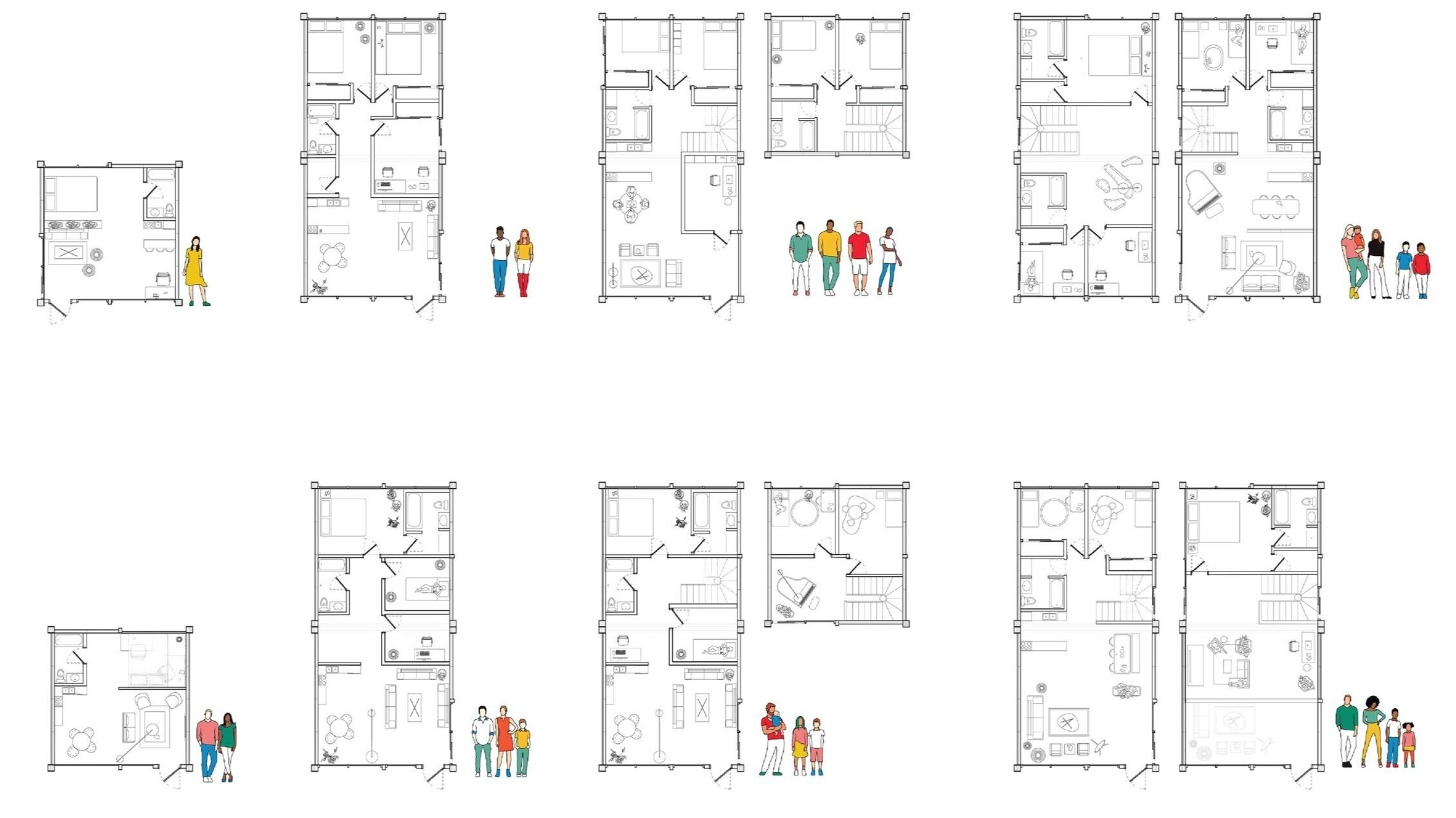 20’ x 20’ x 12’ blocks can be arranged in units of up to four blocks. This allows for a variety of living situations from single adults, to multigenerational families.