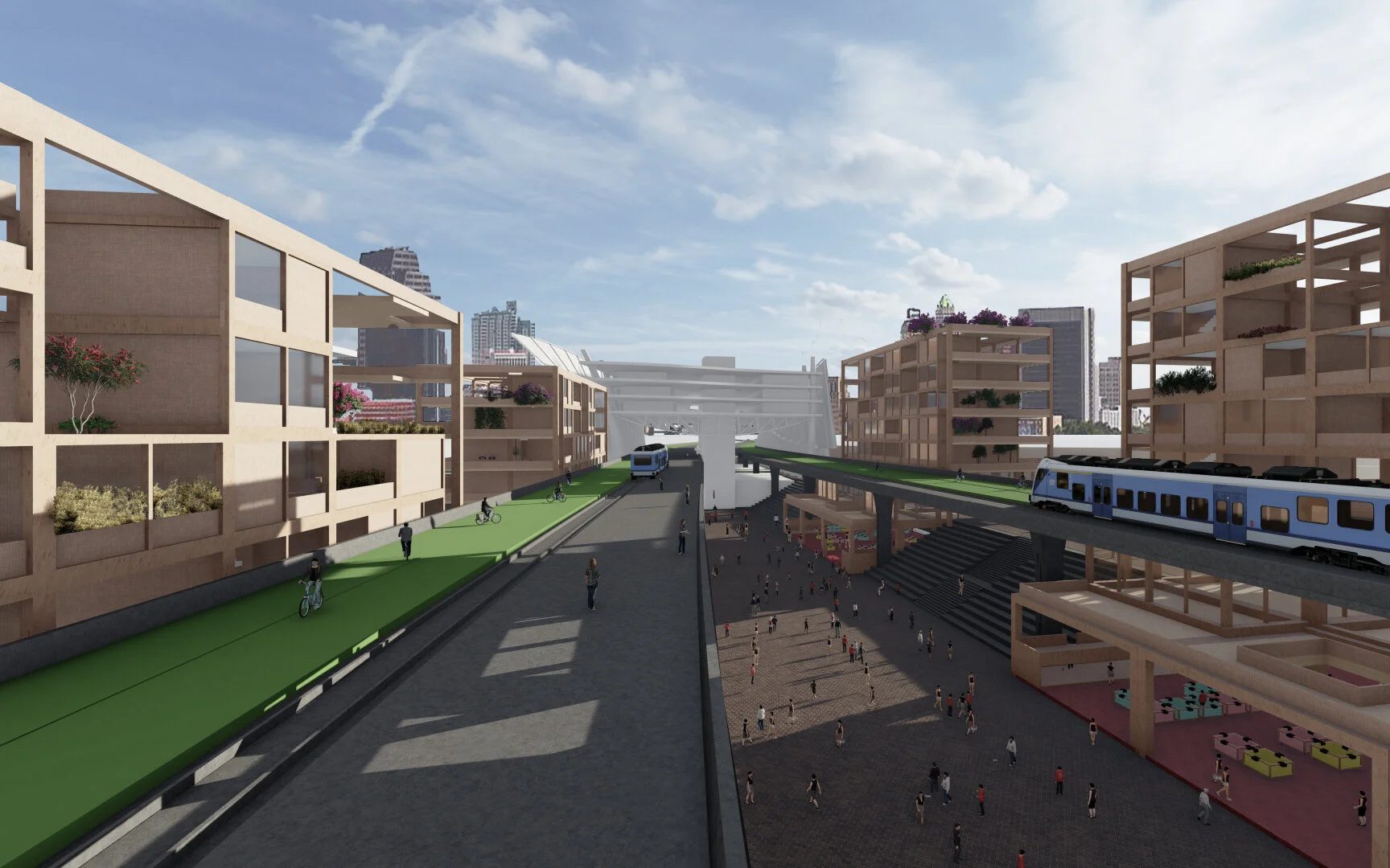 The Highway Housing blocks are constructed adjacent to the light rail and bike path that shades the market.